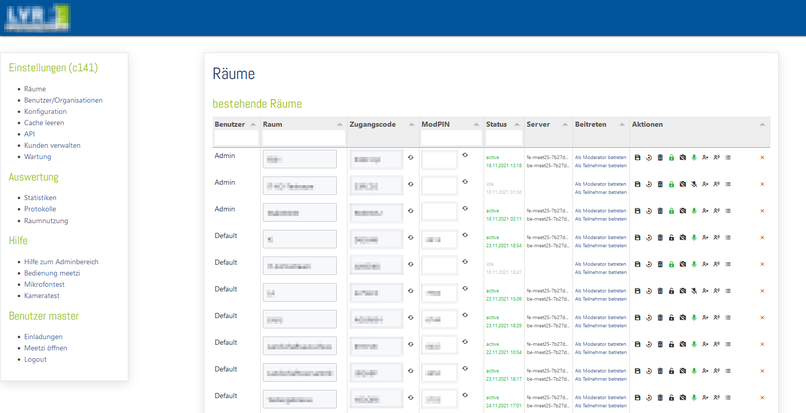 Über das Verwaltungsbackend können Sie alle Räume, Benutzer und Organisationen zentral verwalten, das Layout Ihrer meetzi-Instanz verändern sowie auf Statistiken und Raumnutzungsprotokolle zugreifen. Neben CSV-Import/Export Funktionen gibt es auch eine API zum automatisierten Anlegen, Ändern und Löschen von Räumen.